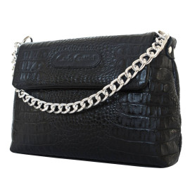 Небольшая кожаная женская сумка Aldeno (Альдено) выполнена из натуральной кожи черного цвета. Сумка состоит из основного отделения под клапаном, внутри которого отделение на молнии, два открытых кармана и перегородка. Клапан выполнен полностью из натуральной кожи. У сумки есть короткая ручка в виде металлической цепочки. Кожаный плечевой ремень р..